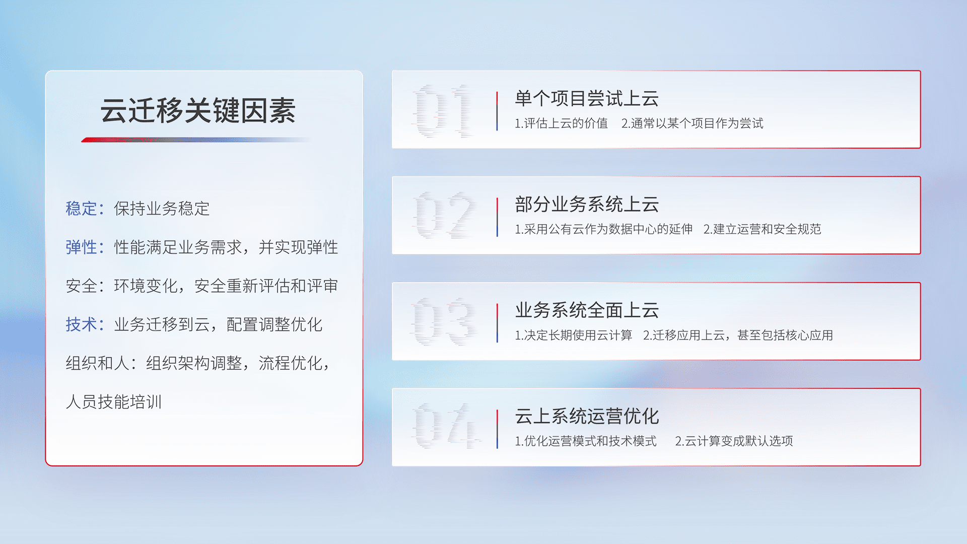 结合实际业务,,,从规划设计、、、云平台选型、、云原生改造、、、数据迁移、、、、集成交付,,,迁移全过程为客户识别最佳上云路径,,做好风险识别管理,,,设计网络架构、、、身份权限、、、安全审计合规、、操作审计、、、、日志审计、、、监控告警策略、、、多站点容灾设计等,,对云上基础设施进行整体规划,,,,提升IT治理水平,,,,以满足弹性、、、高可用、、高性能的需求。。