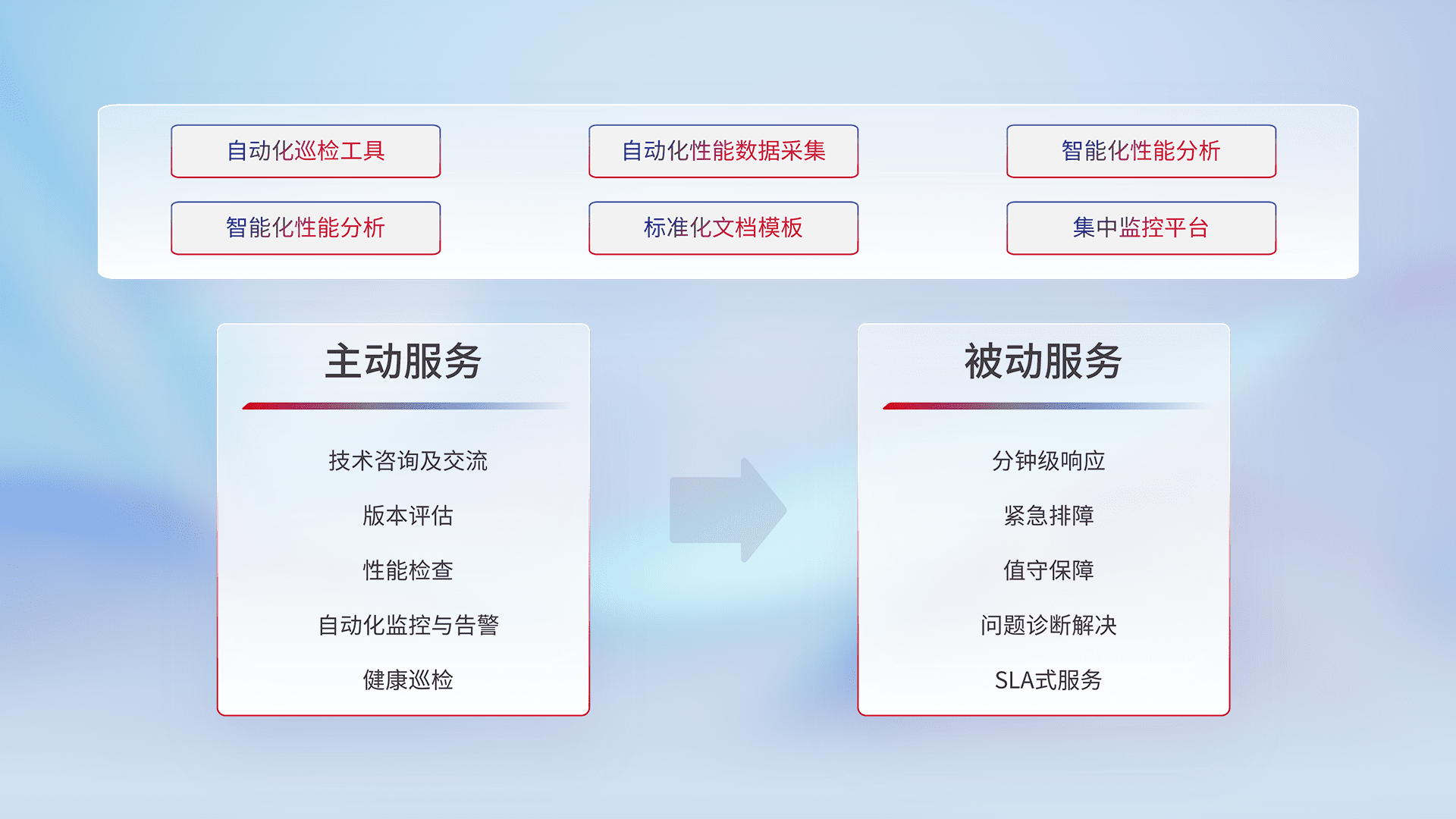 智能化工具和标准化文档,,保障服务质量,,,,提供主动服务(包含技术咨询、、、版本评估、、、性能检查、、自动化监控与告警、、、、健康巡检)和被动服务包含(分钟级响应、、紧急排障、、值守保障、、、、问题诊断解决、、、SLA服务)。。